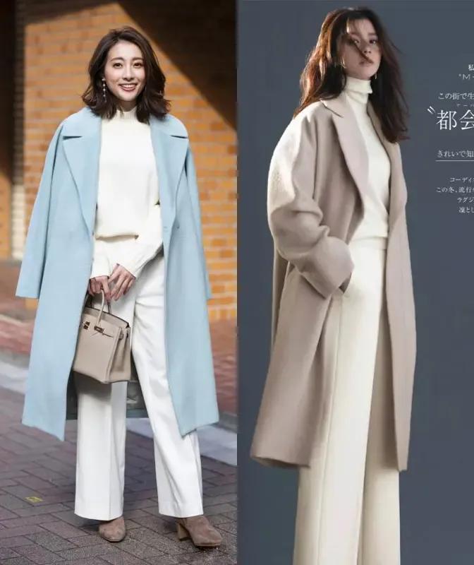 对于骨架比较大,高个子女生形象比较成熟的女性,应该要把自己的气质和气场呈现出来,会更好看,不要刻意去装嫩,例如下面这两位达人的穿衣打扮,用浅色系的大衣外套内搭一件毛衣,下半身选择白色的直筒阔腿裤后,这样的穿衣打扮,御姐范儿十足。