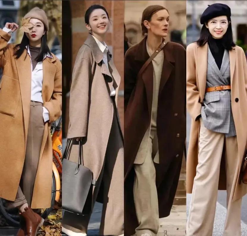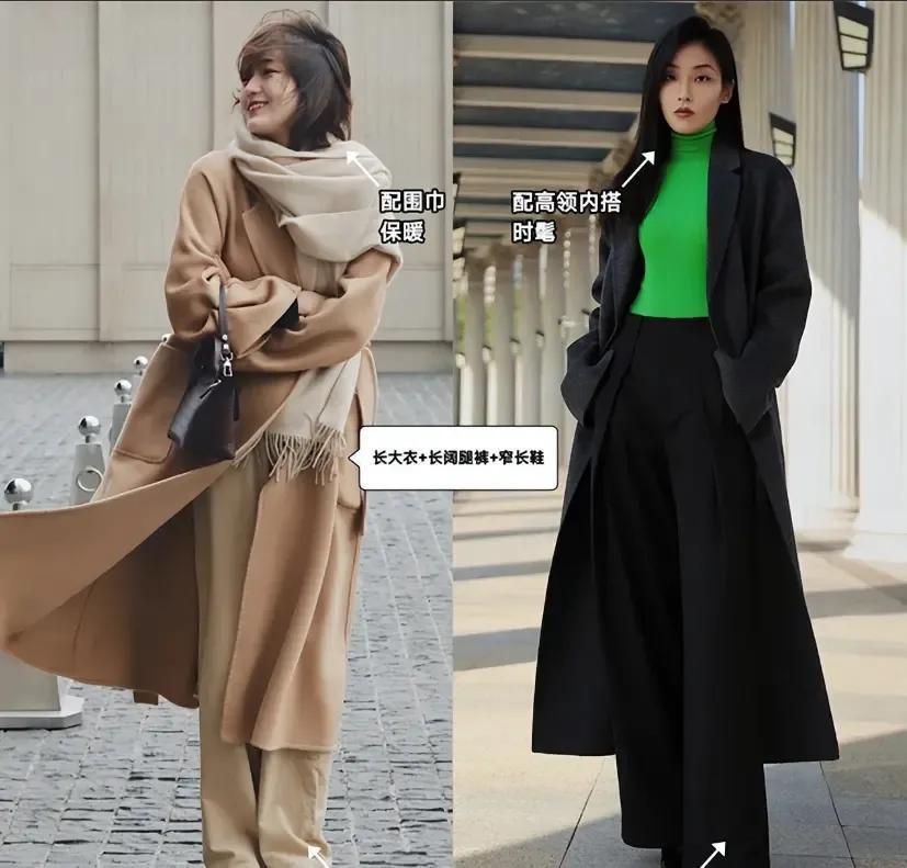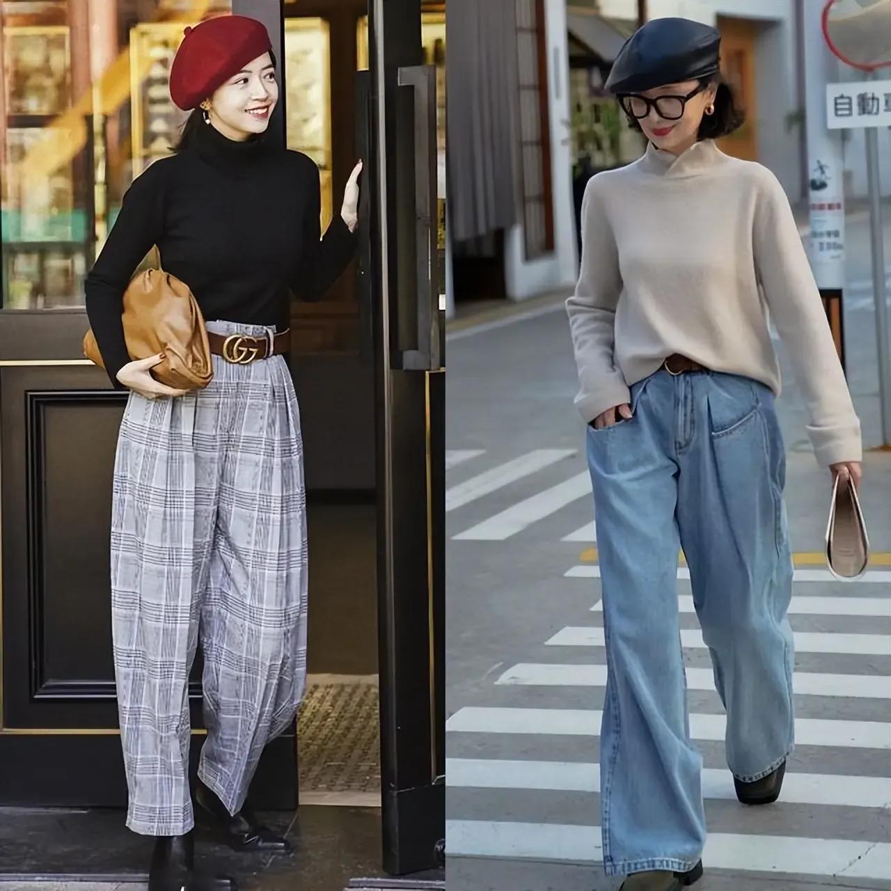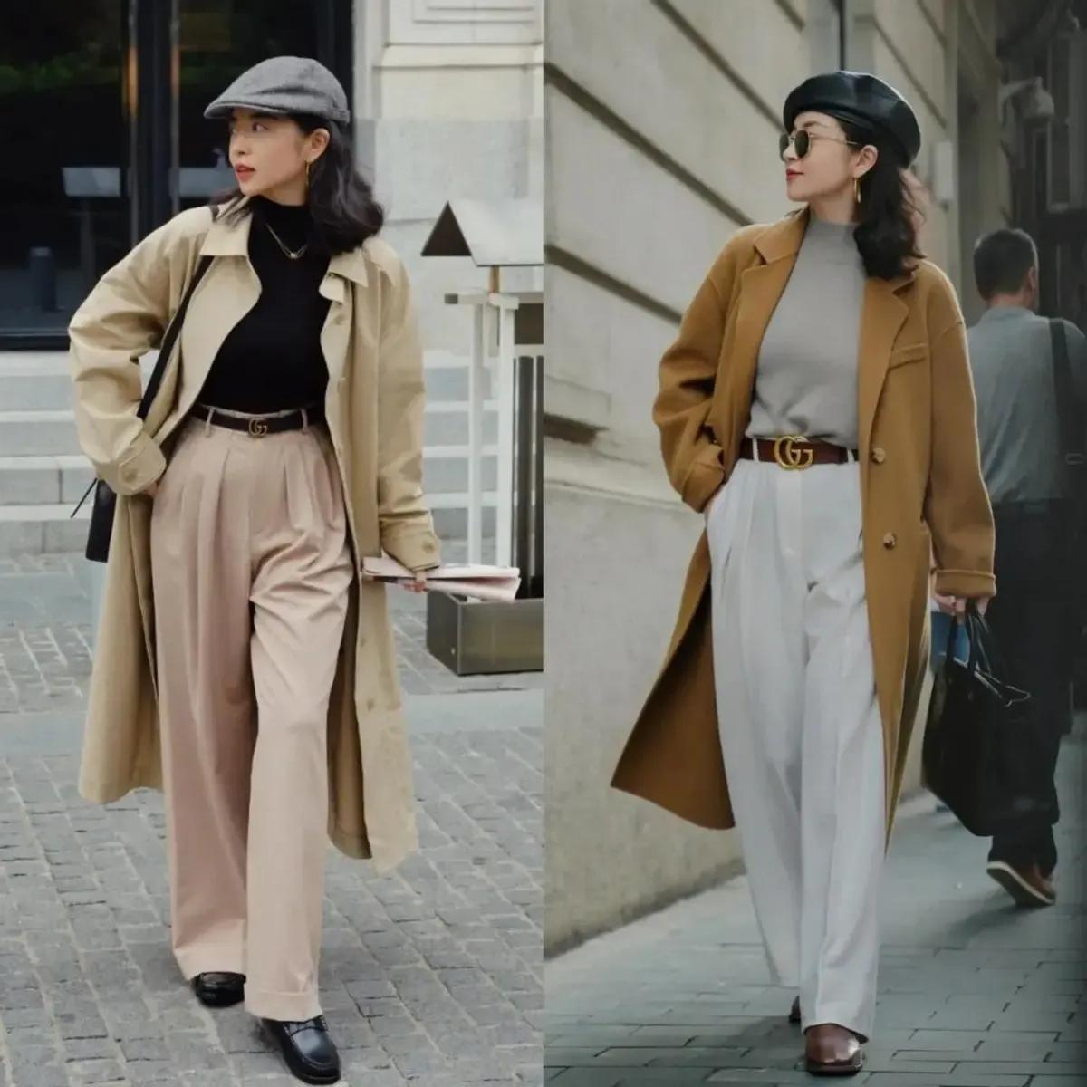 正常情况下来说我个人还蛮推荐大家选择直筒阔腿裤的直筒裤啊,腿裤的版型并不是太大,而且穿在身上之后挺括有型,例如下面这两条西装面料的直筒阔腿裤搭配上大衣外套,内搭一件毛衣针织衫,轻轻松松穿出女神范。