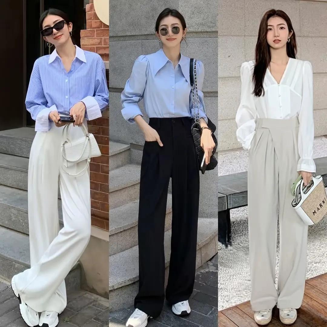 当你换成阔腿裤西装裤的时候,一定也要选择有垂坠感的裤子面料,例如下面这三条就能穿出一种慵懒感,搭配上蓝色的衬衫或者是白色的衬衫,脚踩一双运动鞋,德训鞋呈现出一种休闲感。
