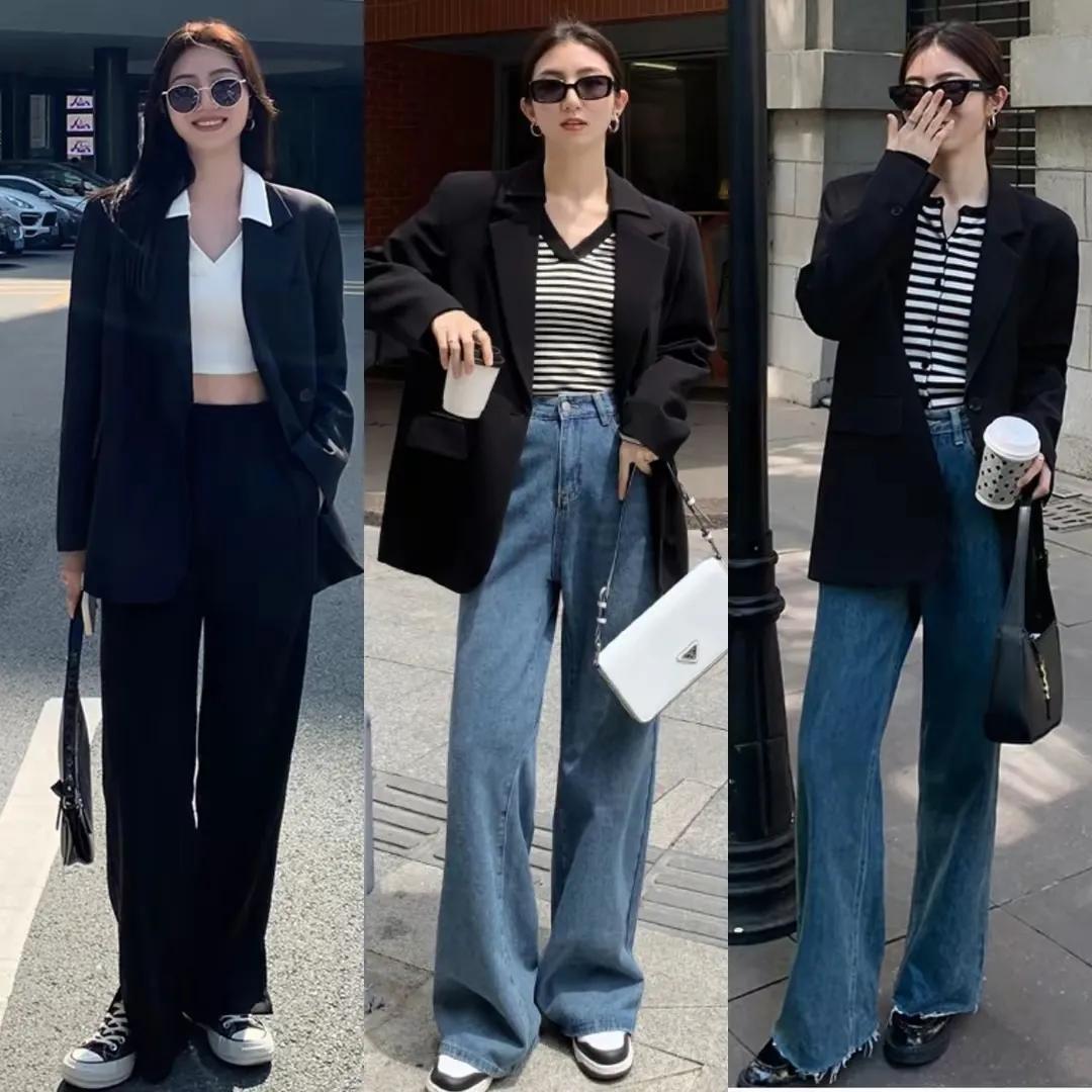 比如说下面这三套穿衣打扮就分别选择了一双帆布鞋,平底鞋,乐福鞋搭配上黑色的开叉长裤牛仔裤,这样的穿衣造型呈现出来的效果完全不同,一个比较时尚,一个比较干练,另一套显得比较休闲。