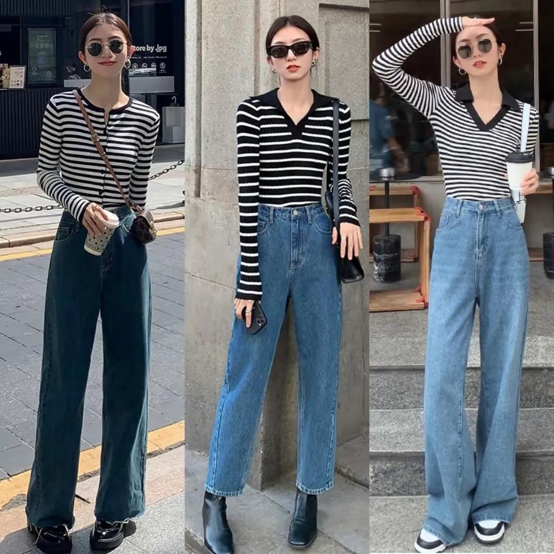 我们可以选择天生就拥有时尚元素的牛仔裤来搭配牛仔裤,搭配任何衣服单品都可以,例如下面这三套穿衣打扮分别不同款式,不同领子的条纹打底衫搭配上牛仔九分裤,直筒裤和微喇叭裤,穿在身上之后,少女感扑面而来,显得年轻貌美。