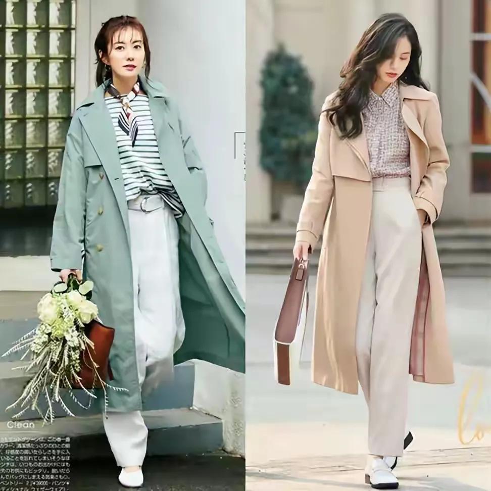 当然,如果你是在南方城市,天气很暖和,就没必要选择带外套了,可以换成风衣风衣面料比较单薄,穿起来也不会闷热,但也能拉伸整体穿搭造型的氛围感,让你变得又飒又美。例如下面这位达人分别不同颜色的风衣搭一件衬衫或者是条纹衫,下半身选择九分裤,脚踩一双乐福鞋,浅口单鞋就够。